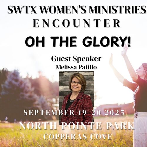 Southwest Texas Women’s Ministries presents the 2025 Women’s Encounter. We will come together at North Pointe Park in Copperas Cove. SWTX is thrilled to have Melissa Patillo back this year as our guest speaker. Lunch and Dinner will be provided Friday by North Pointe Church.